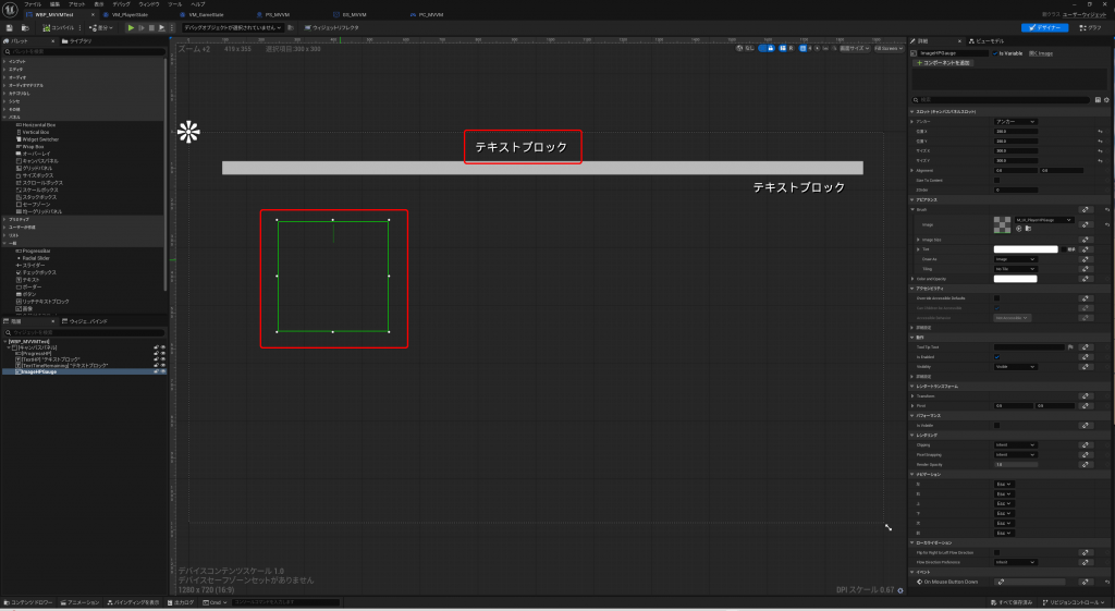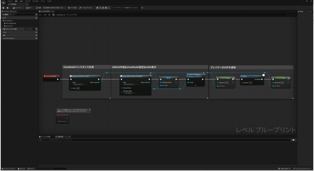 レベルブループリントに実装しているプレイヤーのHPを更新する処理を一切更新せずに、UMG上のテキスト表示のHPを追加することができました。ViewModelをバインドするダイアログでは、ウィジェットの値だけでなく、様々なパラメータに対しても変数をバインドすることができるので、単純にUMGに反映する以外の使い方もありそうです。