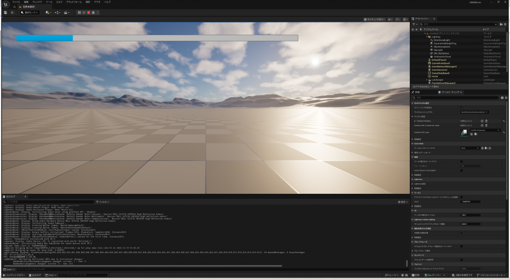 早速プレイしてみると、画面上にProgressBarのHPゲージが表示され、最初はゲージが0.1の位置にありましたが、1秒後に0.2の位置に移動するはずです。UMG側のBPは一切触っていないのに、”VM_PlayerState”の”PlayerHP”を更新するだけでUMGに反映されたことが分かります。