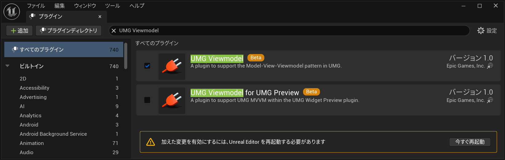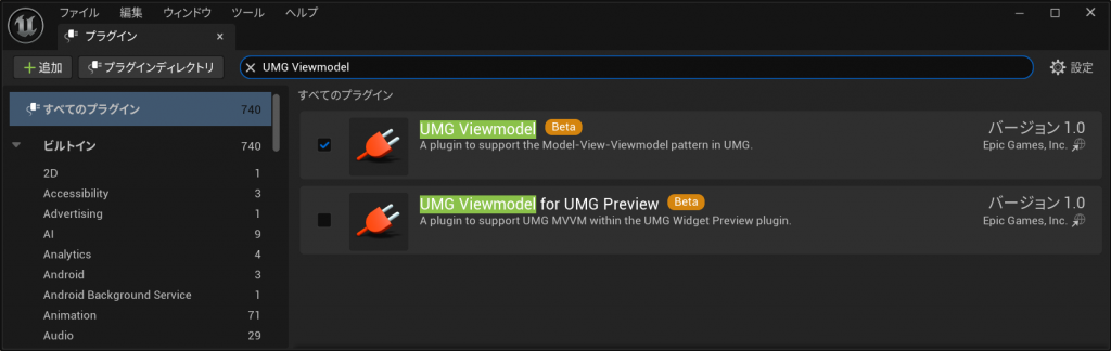 「編集」→「プラグイン」から”UMG Viewmodel”を有効にしてください。(その後再起動)