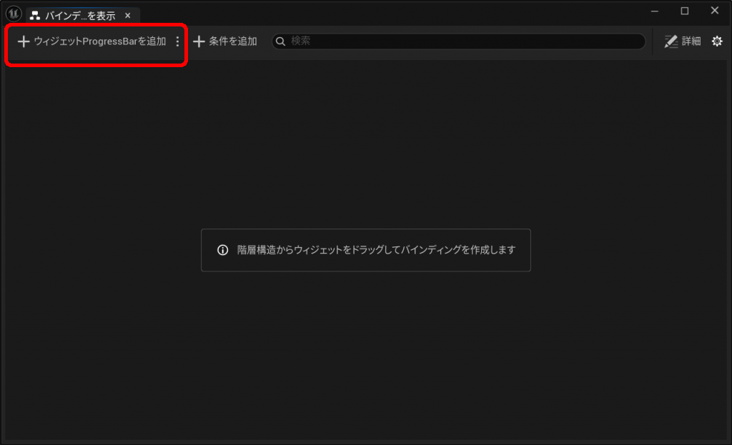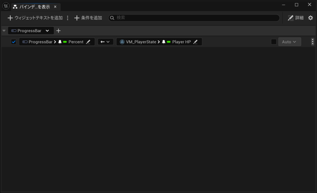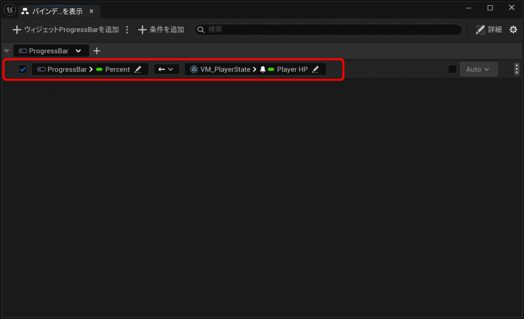 ProgressBarに対して、VM_PlayerStateに含まれるPlayerHPを割り当てます。まずは、UMGのデザイナー上でProgressBarを選択状態にしたら、バインディングを表示ダイアログの左上にある「+ウィジェットProgressBarを追加」をクリックしてください。