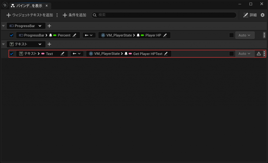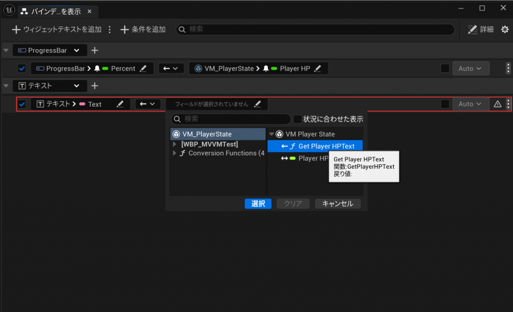 ダイアログ左上の「ウィジェットテキストを追加」をクリックして、VM_PlayerStateのGetPlayerHPTextの値をテキストウィジェットのTextにバインドする定義を作成します。