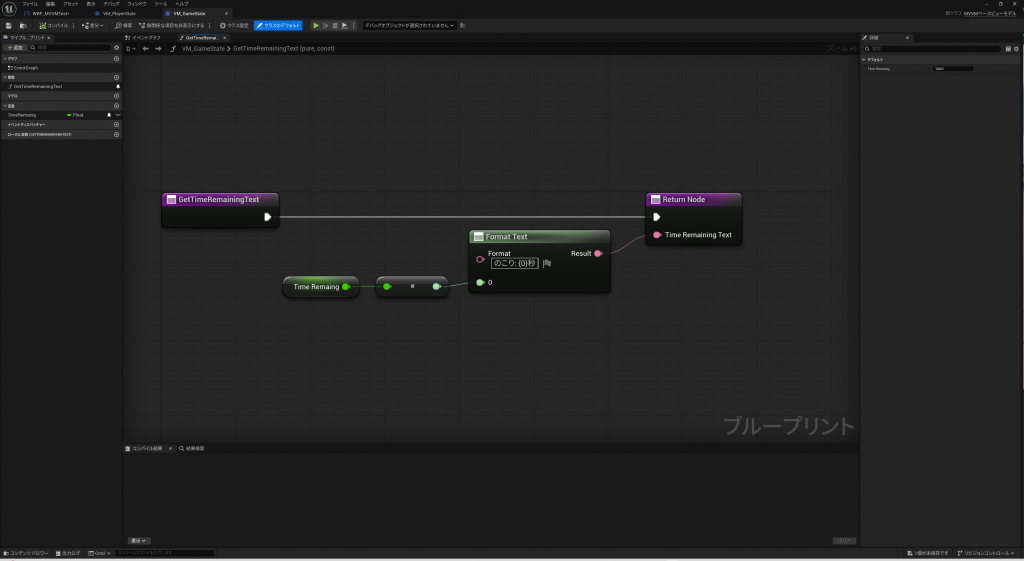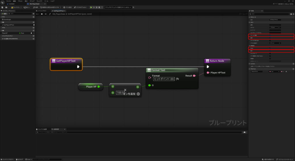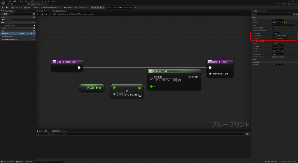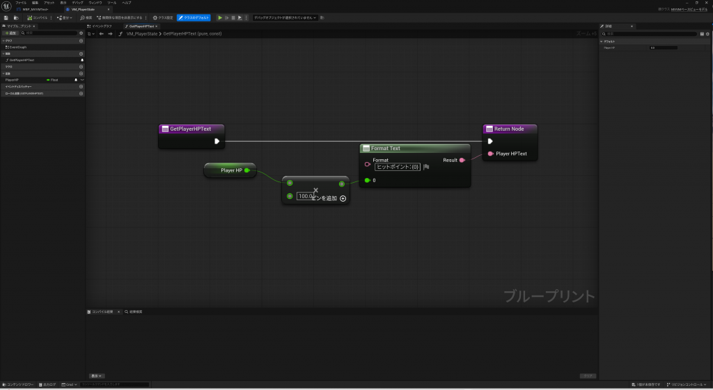 “VM_PlayerState”に”PlayerHP”をテキスト型で受け取れる関数(GetPlayerHPText)を実装します。PlayerHP(Float型)は0~1でHPを管理していたのですが、見栄えが悪いので100倍してから文字列にしてみましょう。