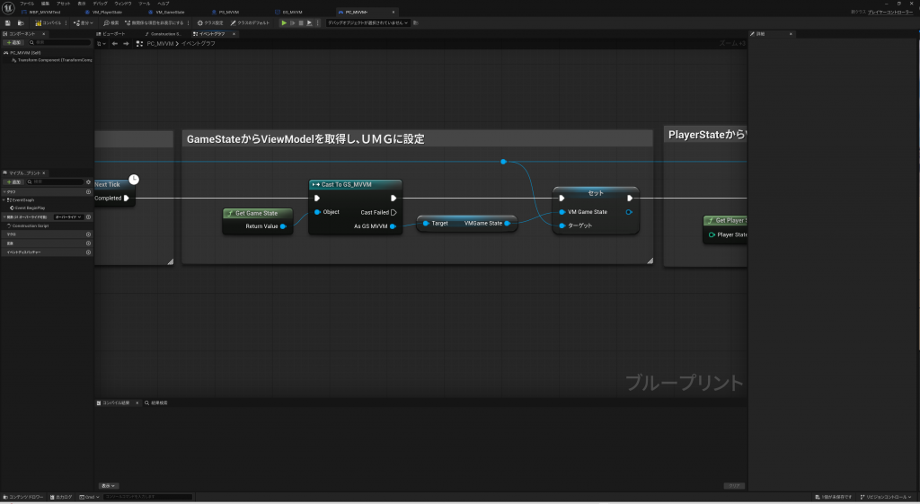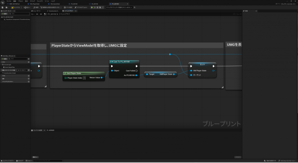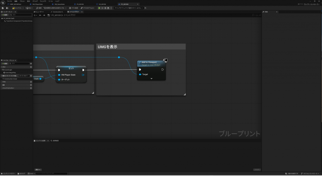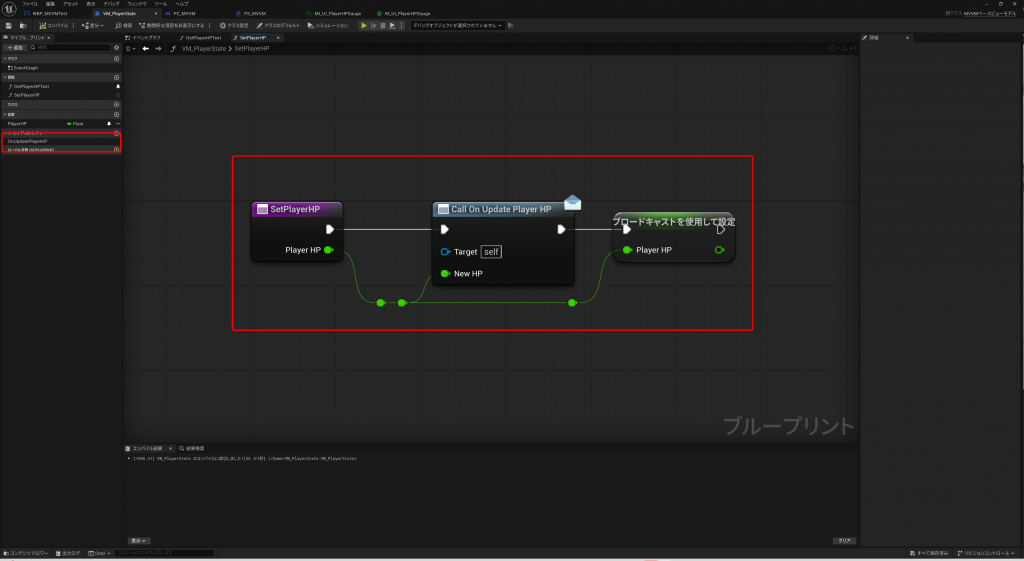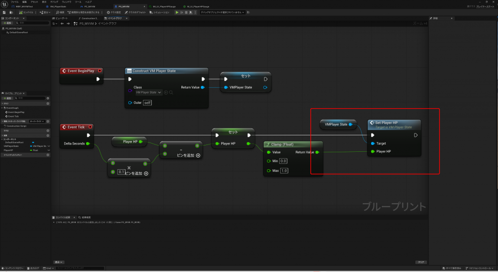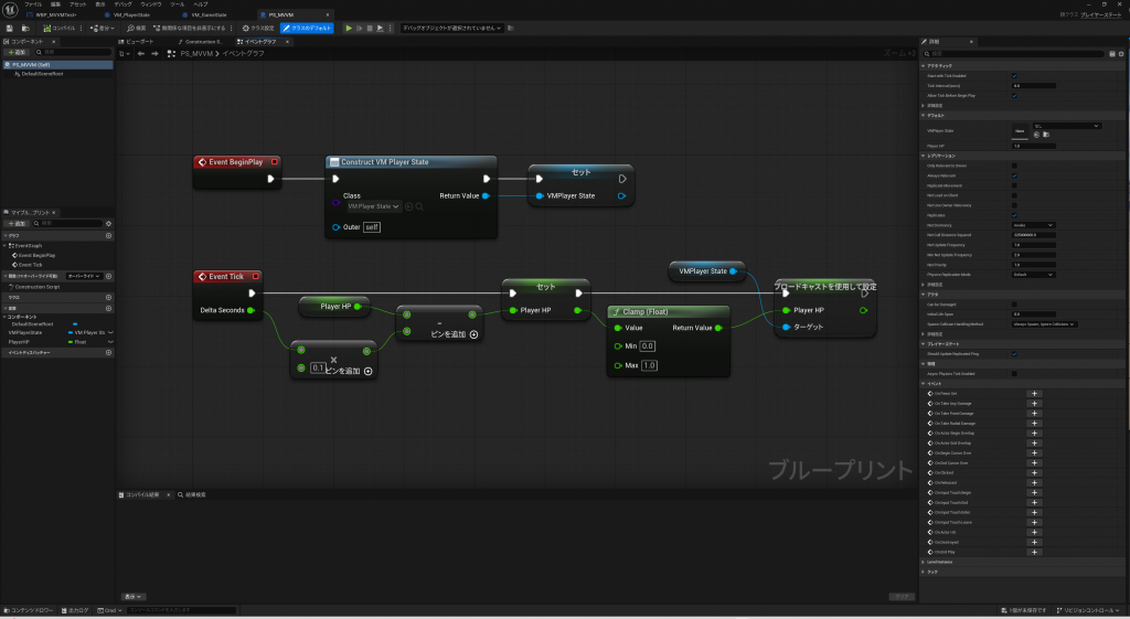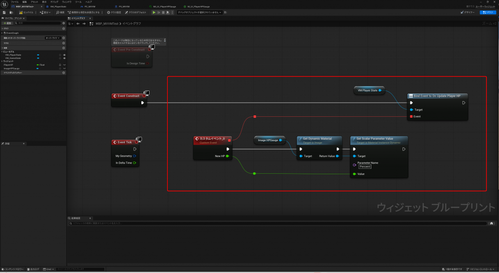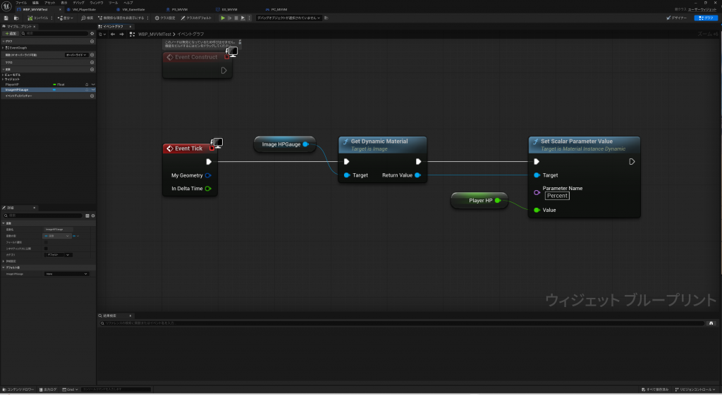 重要なのは、UMGにViewModelを追加すると、イベントグラフの変数として使えるようになる為、VM_PlayerStateからOnUpdatePlayerHPイベントのバインドをConstructで定義しているところです。