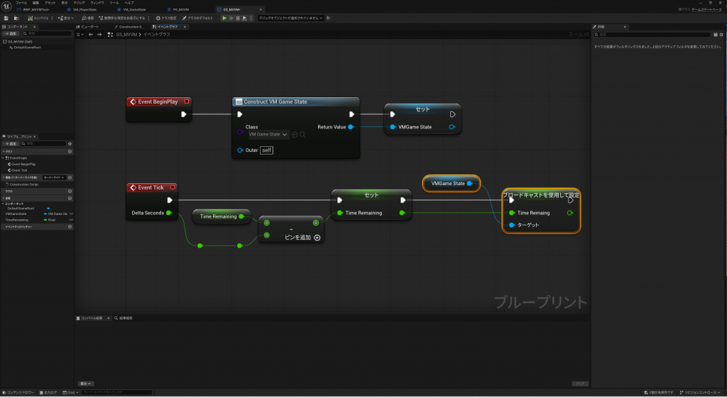 GameState(GS_MVVM)を作成します。ここでは残り時間の管理を想定しています。上記のPlayerStateのHPが残り時間に変わっただけなので、GameStateとPlayerStateはほぼ同じ構成です。