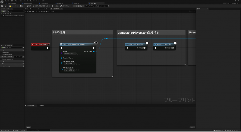 最後にPlayerControllerでUMGを表示させます。(本来はもっと適切なタイミングで実装する必要はありますが)GameStateのViewModelとPlayerStateのViewModelをそれぞれ取得し、”UMG_MVVMTest”のViewModelにセットしてから、Add to ViewportでUMGを画面に表示しているだけです。