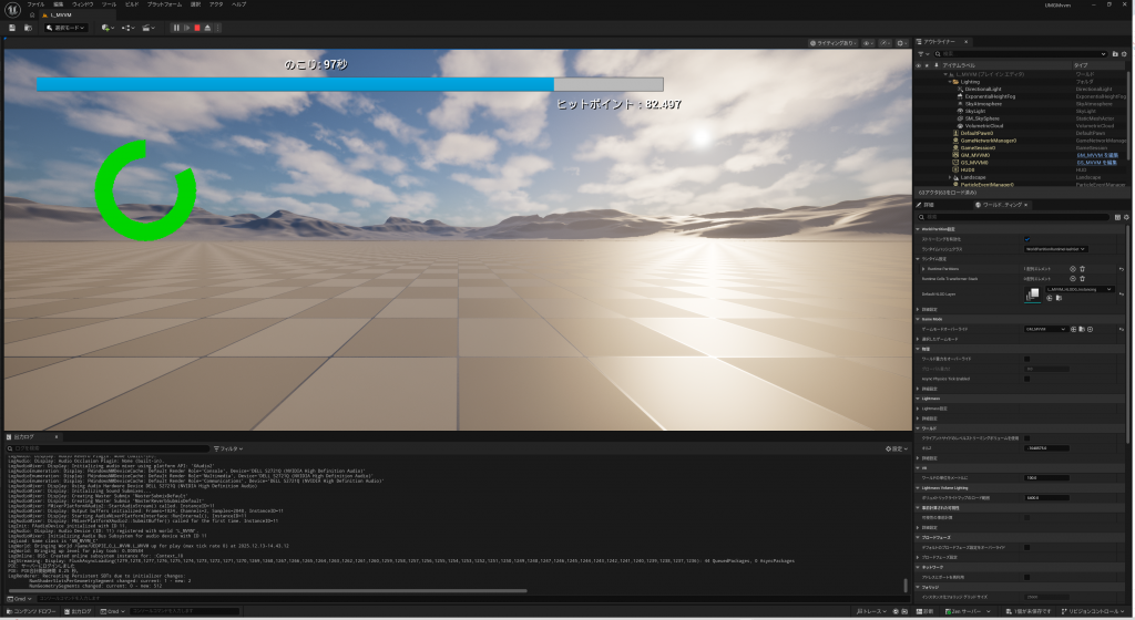 実行すると自動的に残り時間と、プレイヤーのHPが減少するUMGが表示されます。円型ゲージも、残り時間もすべてが正常に動いています。