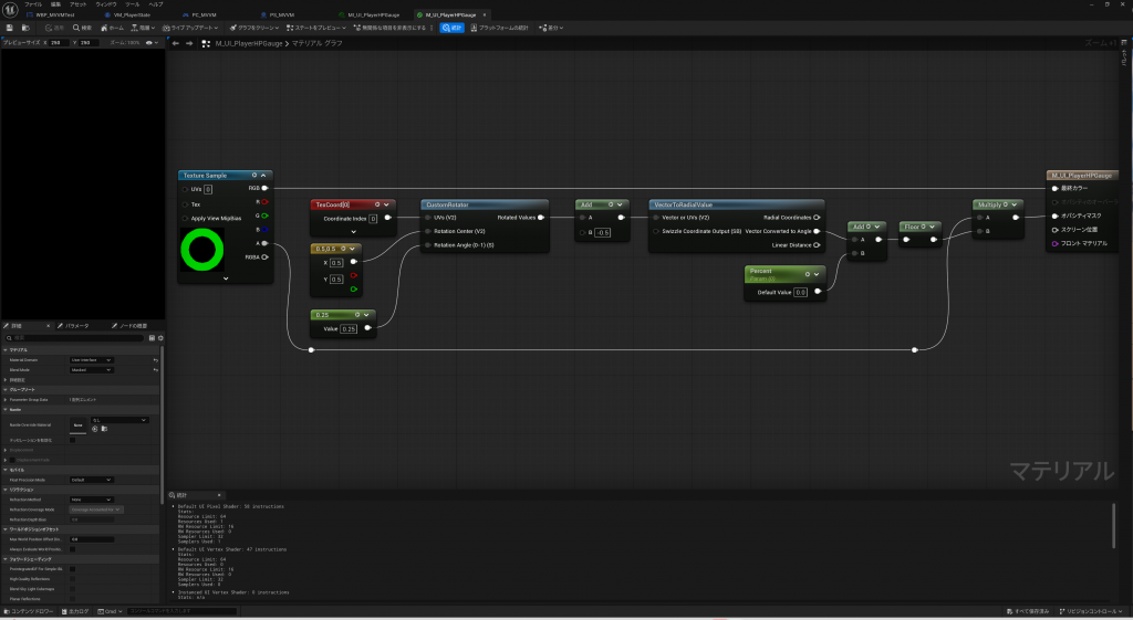 これで、ViewModelのPlayerHPが変更された場合にイベントディスパッチャーが呼び出されるようになったので、UMG側ではイベントを監視して、PlayerHPに変化があったら円型ゲージのマテリアルパラメータを更新するようにします。