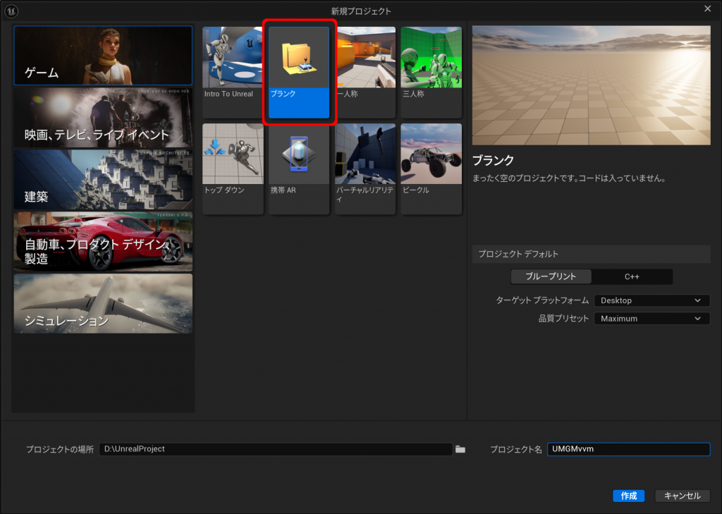 ブランクプロジェクトでプロジェクトを始めます。プロジェクト名は”UMGMvvm”としました。