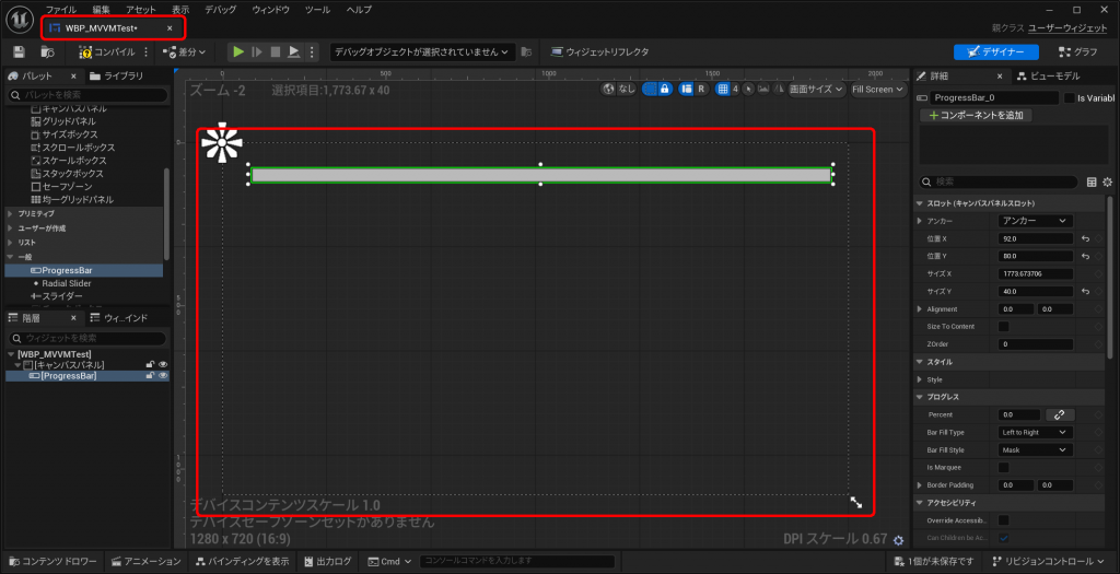 今回は”WBP_MVVMTest”という名前で作成しました。(コンテンツドロワー上で右クリック、「ユーザーインターフェース」→「ウィジェットブループリント」からUMGを新規作成し、デザイナーでキャンバスパネルとその配下にProgressBarを適当に配置してください。これがプレイヤーのHPとなります。)
