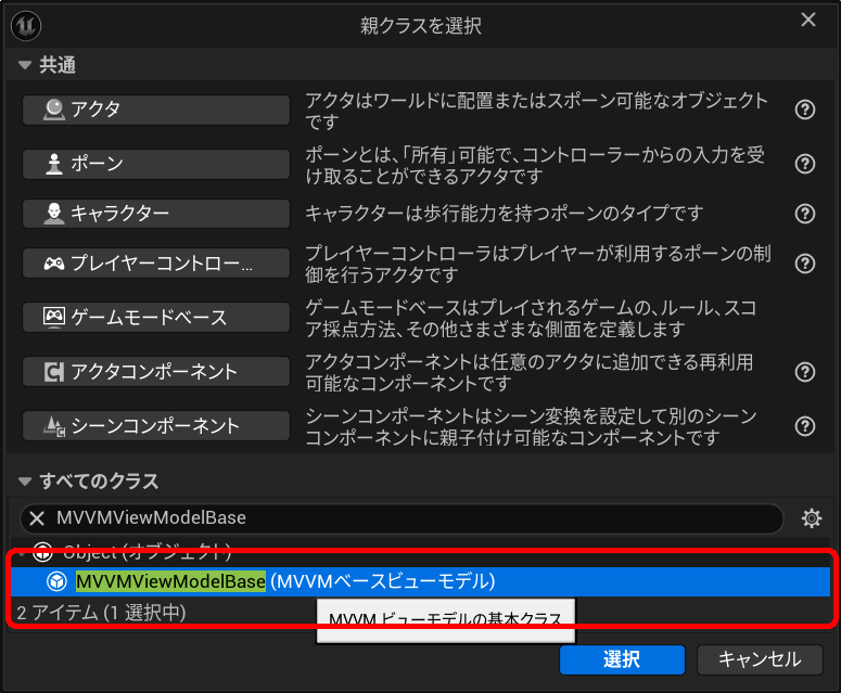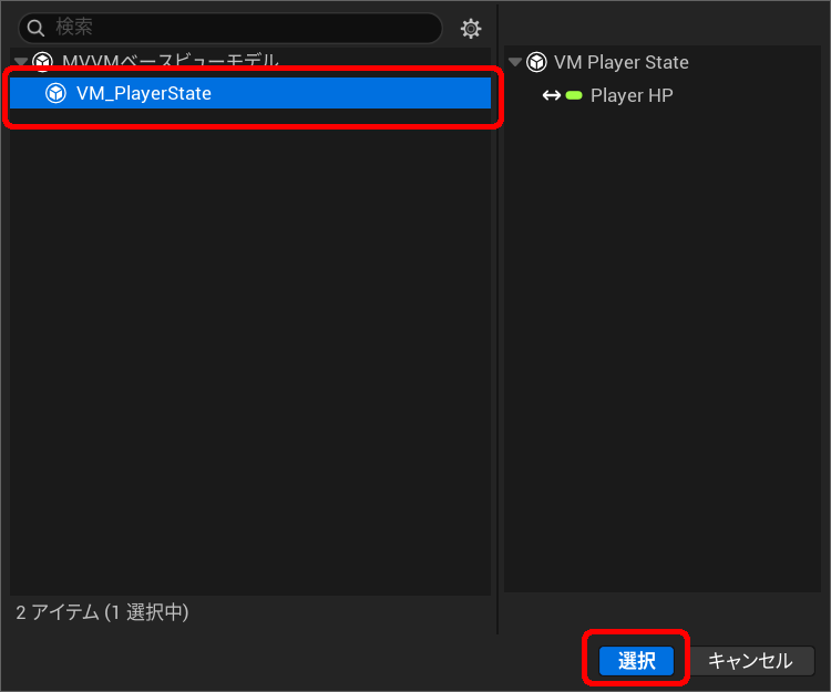 先ほど作成した”VM_PlayerState”が表示されるので、左クリックで選択した状態でダイアログ下部の「選択」ボタンをクリックしてください。