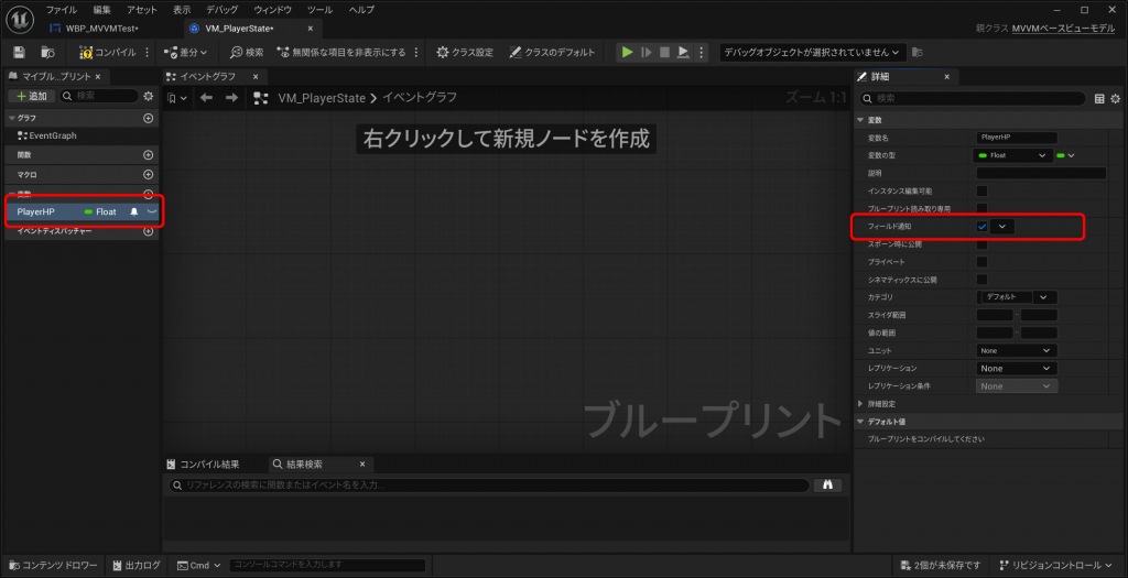 上記4.で作成した”VM_PlayerState”を開き、変数に”PlayerHP”(Float型)を追加してください。この時、詳細パネル内の「フィールド通知」にもチェックを入れてください。この変数がUMG上に表示するプレイヤーのHPの数値となります。