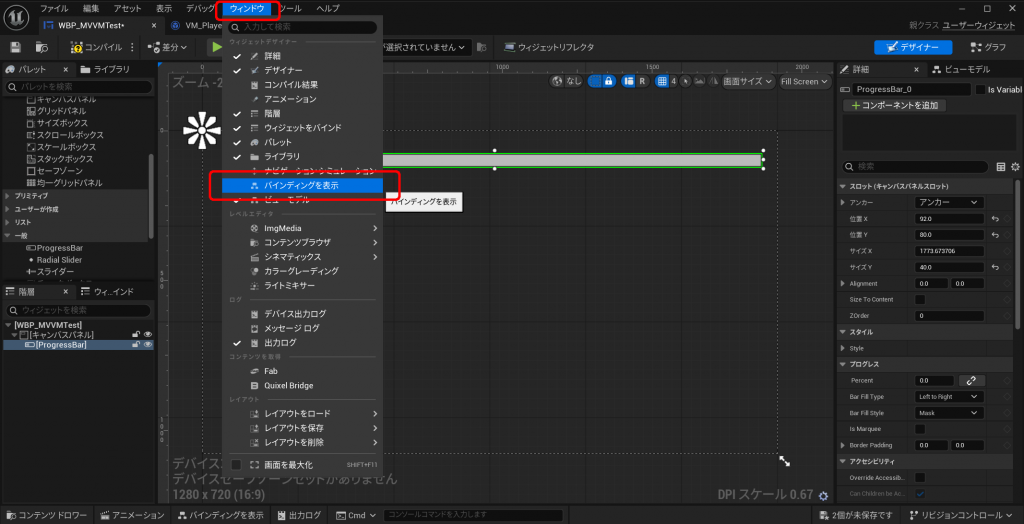 “WBP_MVVMTest”に戻り、「ウィンドウ」から「バインディングを表示」を選択してください。
