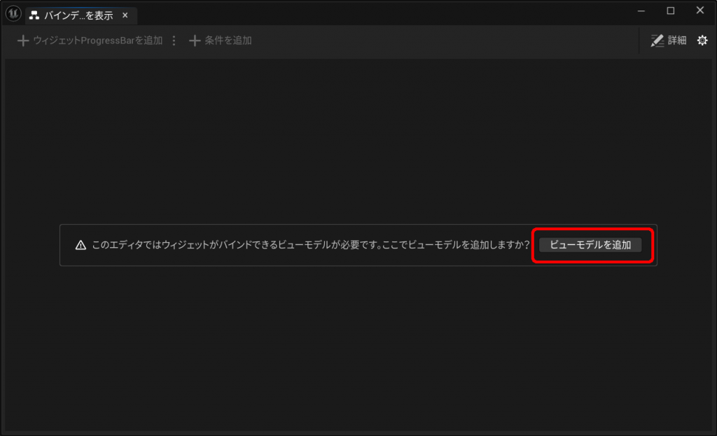 「このエディタではウィジェットがバインドできるビューモデルが必要です。ここでビューモデルを追加しますか?」と表示されるので、「ビューモデルを追加」ボタンをクリックしてください。
