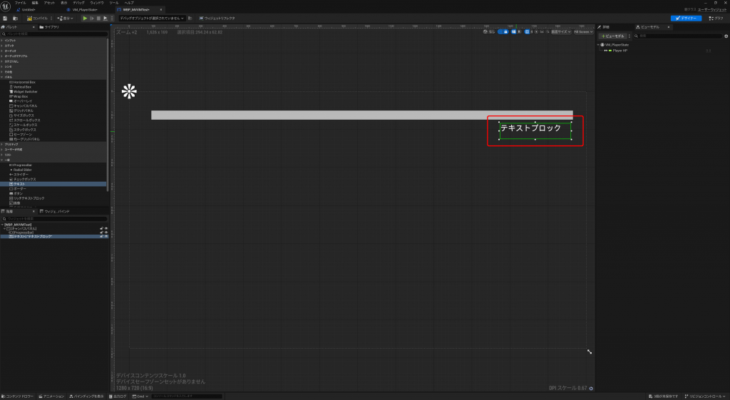 UMG側にもテキストウィジェットを追加して、バインドを定義しないといけません。まずは、テキストウィジェットを追加します。これは、単純に配置するだけですね。