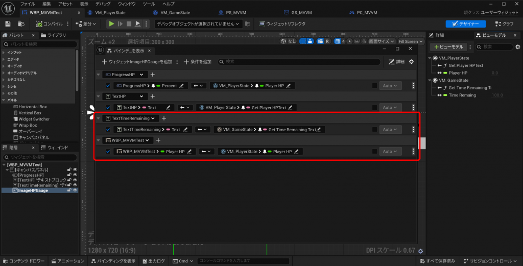ここが結構重要です。「ビューモデル」ウインドウ内でVM_PlayerStateとVM_GameStateの2つのViewModelを追加しておき、「バインディングを表示」ダイアログにて、各ウィジェットに対して値をバインディングしていきます。ただし、円型ゲージにおいてはProgressBarと違ってウィジェット自体のプロパティで円を描画するワケではないので、WBP_MVVMTestにPlayerHP(Float型)の変数を追加したうえで、その変数に対して直接ViewModeのPlayerHPをバインドしています。つまり、ViewModelの値は各ウィジェットのプロパティ以外にも、UMGに定義した変数にも直接バインドすることができます。